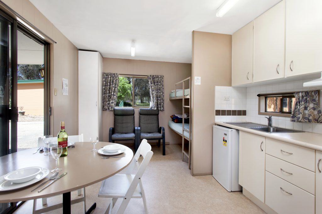 The Standard 1.5 Bedroom is perfect for a couple looking to stay a few nights. Fully self contained, the cabin boasts a full sized kitchen including oven, stove and full sized fridge. The refurbished ensuite, seperate queen room, reverse cycle air-conditioning and TV make it the perfect home away from home. Sleeping up to 4 people, with linen included on all beds. 3 star.